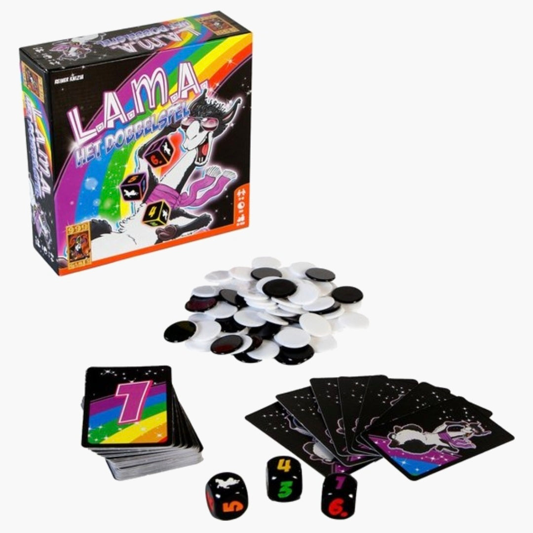 Het populaire kaartspel L.A.M.A. is terug… als dobbelspel! Rol met de dobbelstenen om zoveel mogelijk kaarten en minpunten af te leggen. Heb je een kaart met hetzelfde getal als een van de dobbelstenen? Dan mag je deze afleggen. Heb je dat niet? Dan moet je een kaart met hetzelfde getal uit de Lama-rij pakken. Hoe langer je wacht met uitstappen, hoe groter de kans op meer strafpunten. L.A.M.A.: Het Dobbelspel is net als zijn voorganger snel en makkelijk te leren. Door de dobbelstenen kent deze variant iets meer tactiek. Uit de ronde stappen of toch kijken hoeveel geluk (of pech!) je hebt, wordt zo een belangrijke keuze. Tegelijkertijd is het spel dankzij de zwarte en witte fiches nog steeds herkenbaar als echt L.A.M.A.