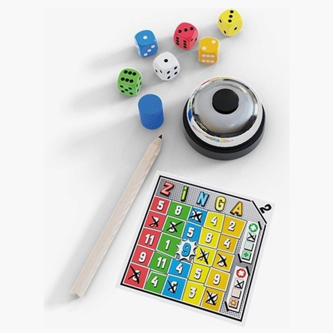 Zinga is een vrolijk dobbelspel, waarbij roll & write wordt gecombineerd met een reactiespel. Om te winnen moet je snel zijn, maar kijk uit voor fouten! Een combinatie noemen die niet bestaat, te lang wachten met iets noemen of jezelf herstellen na een verspreking wordt al gezien als een fout