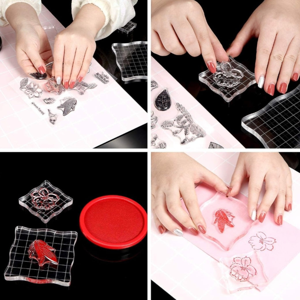 De stempels zijn herbruikbaar. Blokken hebben rasterontwerp zodat het kan helpen met zichtbaar en precies stempels te plaatsen. Blokken zijn ca 0,8 cm dik.