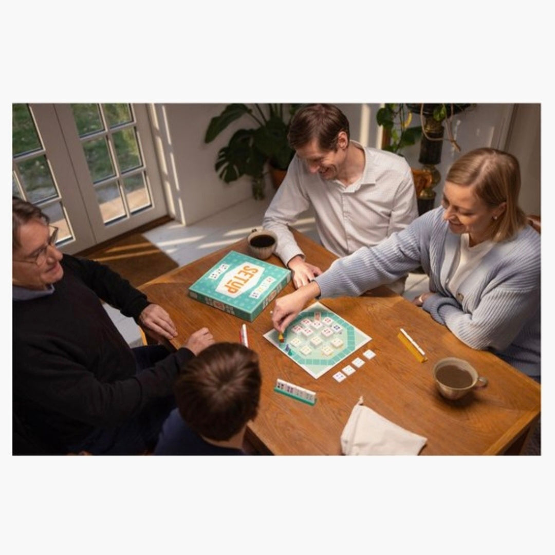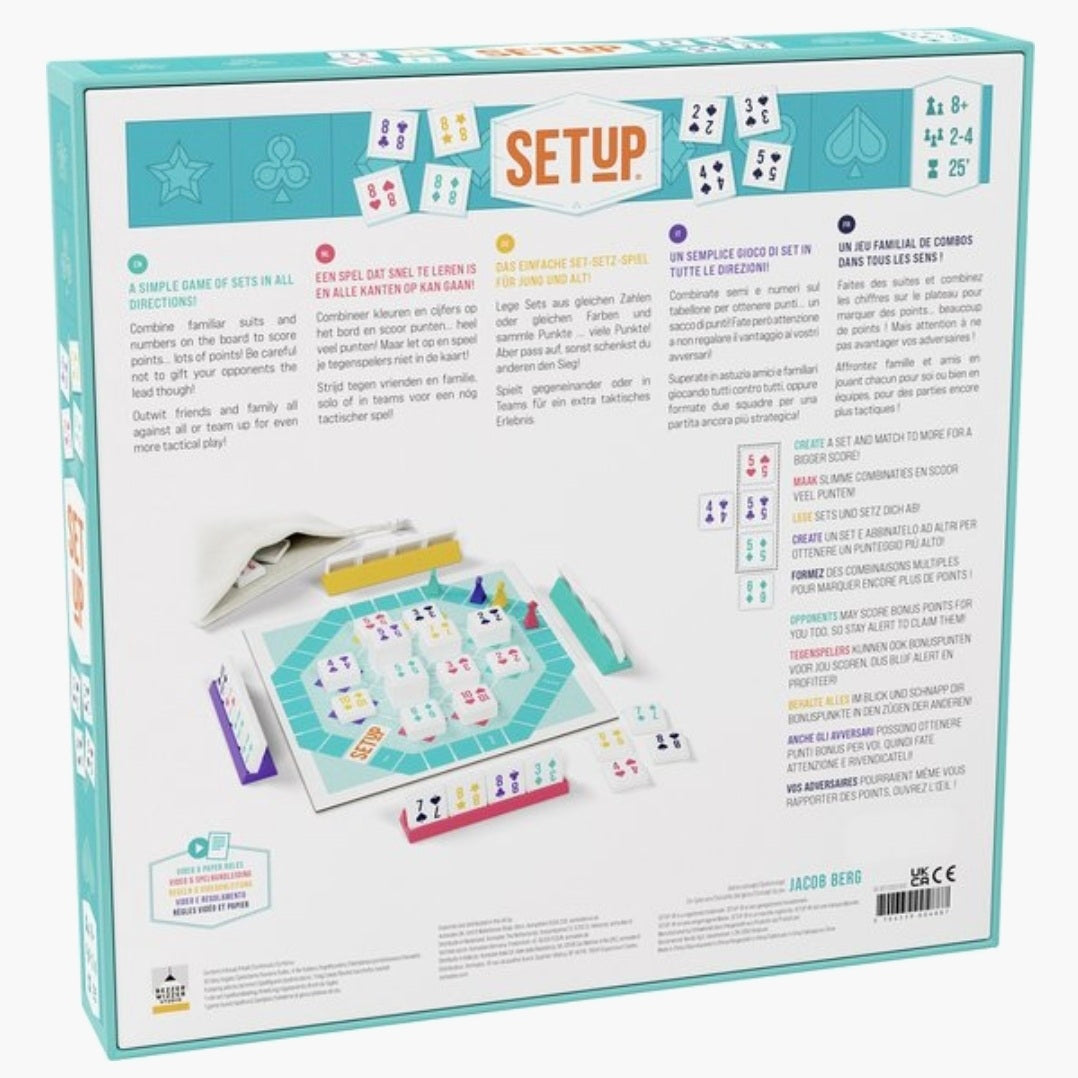 Combineer kleuren en cijfers en scoor zoveel mogelijk punten in een speluitdaging van tegels en tactiek! SETUP is een innovatief nieuw spel in het rummikub genre met score-mogelijkheden in alle richtingen dat snel te leren is en alle kanten op kan gaan. Strijd tegen vrienden en familie, solo of in teams voor een nóg fellere competitie!