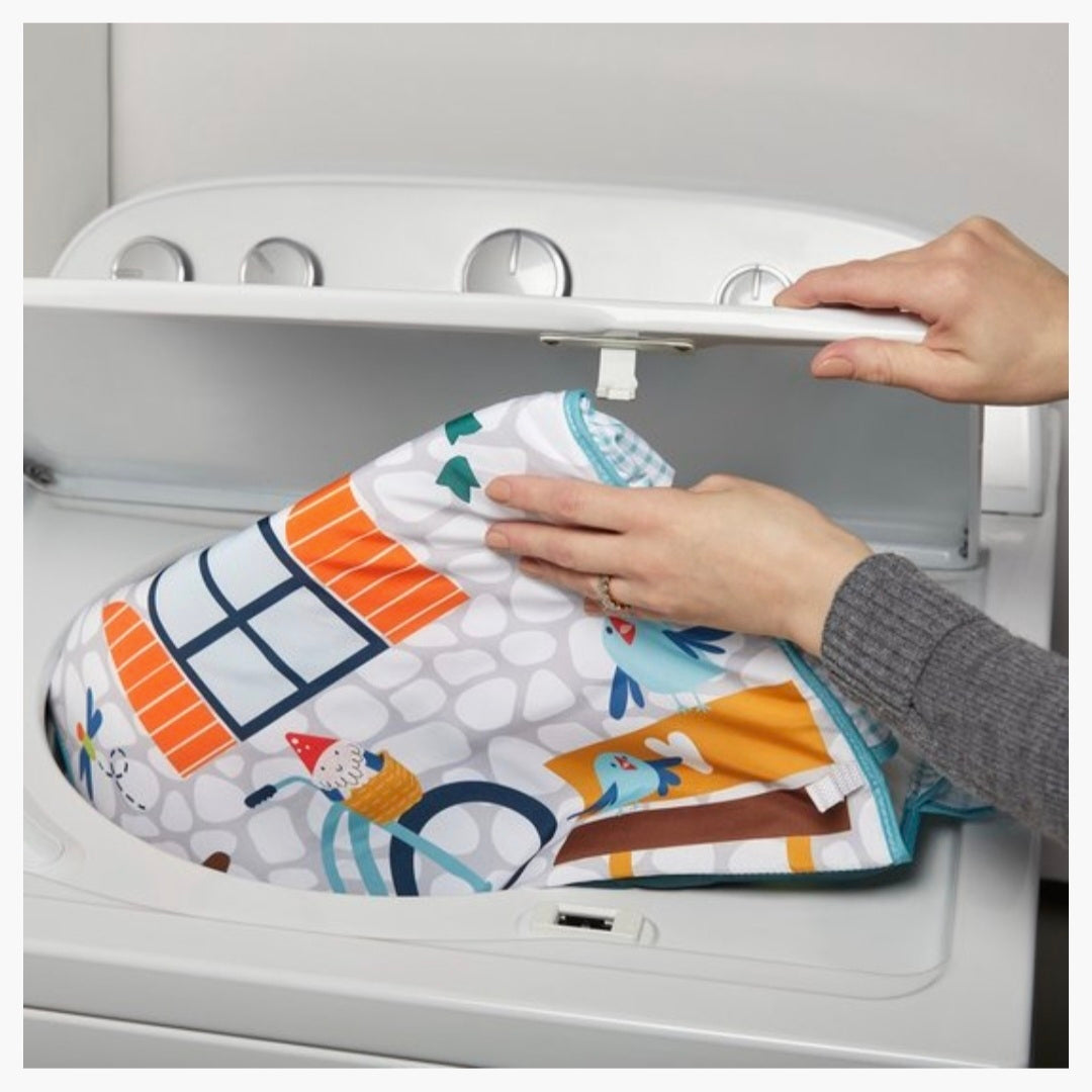 De speelmat kan in de wasmachine en biedt baby en peuter meer dan genoeg ruimte om te spelen