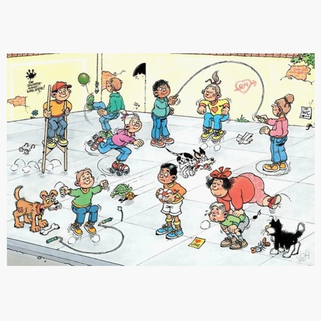 Pauze op school betekent tijd om te spelen! De vrienden van Jan van Haasteren houden van rolschaatsen, touwtjespringen en bokspringen. Wat doe jij graag tijdens het spelen? Deze humoristische puzzel van 240 stukjes is geschikt voor kinderen vanaf 6 jaar.
