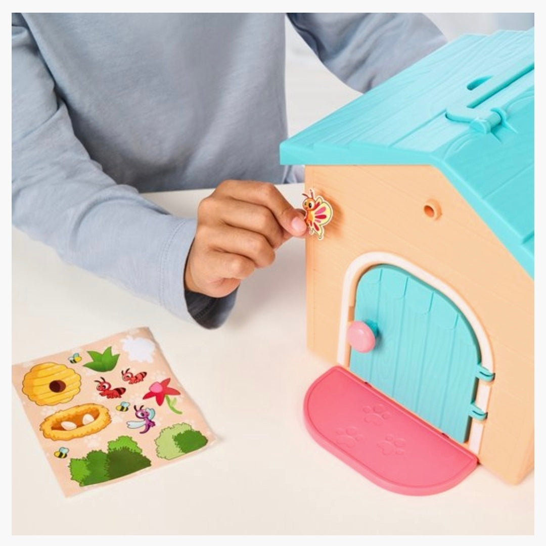 Bevestig de deur aan het huis, schuif het welkomstmatie erin en versier het huis met de schattige stickers van het stickervel. Weet je al een naam voor je puppy? Wordt het Teddy, Max of Evi? Schrijf de naam op het naamplaatje en bevestig het bordje met de hamer en spijker aan de voorkant van het huis!