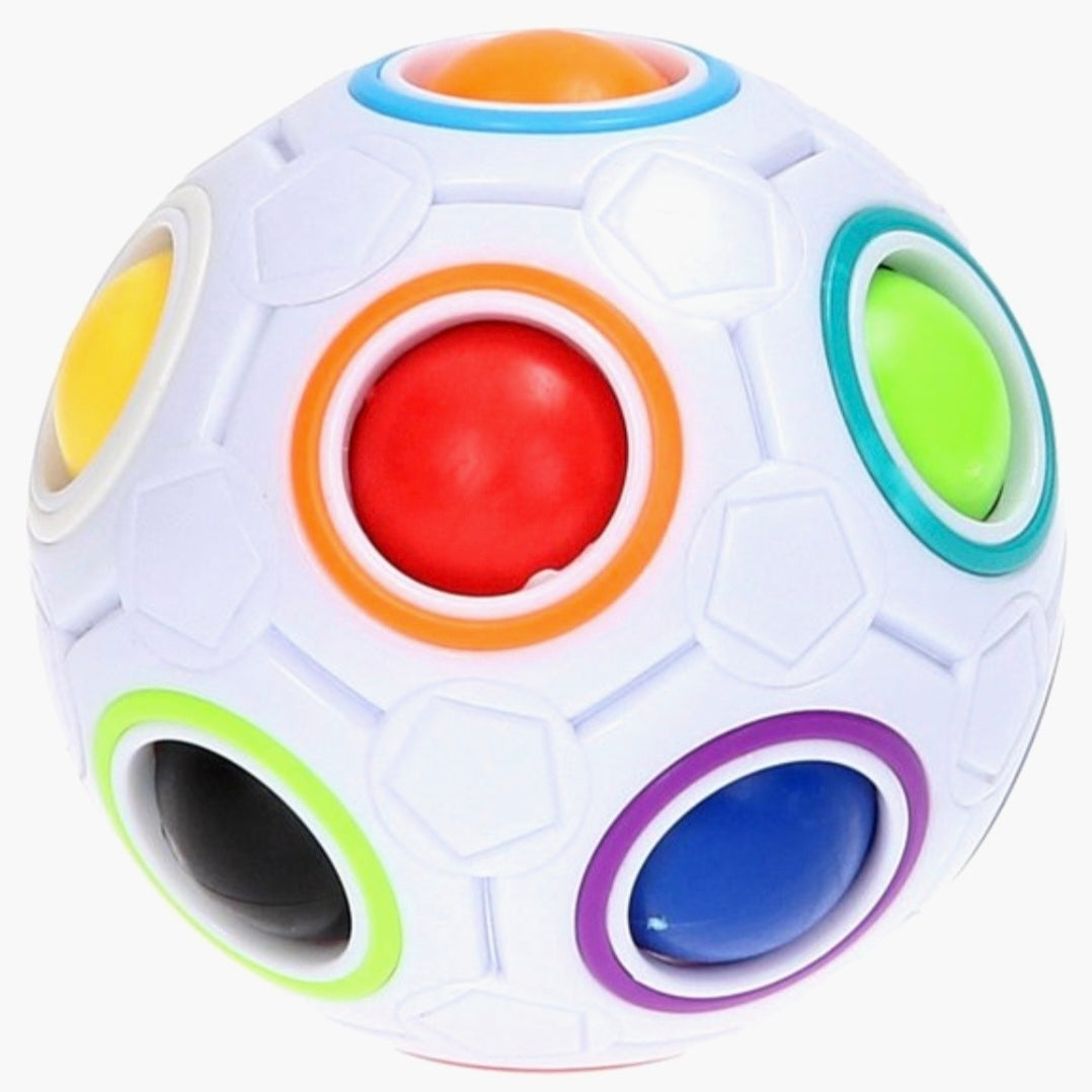 Dit is een Magische Bal of Regenboog Bal puzzel, een behendigheidsspel waarbij je de gekleurde balletjes in de bijbehorende gekleurde gaten moet plaatsen.