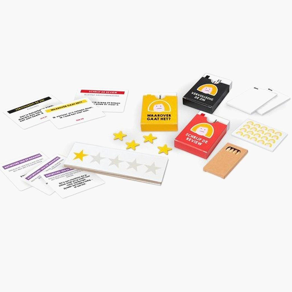 Ken je KAREN? Karen houdt van klagen… veel klagen! Het internet staat vol met Karens die slechte reviews schrijven zoals "Ik kocht een kat voor mijn slang te voederen. De volgende dag stond de politie aan mijn deur" of "Het personeel ruikt hier naar kaas. Gele, gerijpte stinkkaas!". Dit spel is gebaseerd op échte 1-ster reviews van over de hele wereld, dus hou je maar schrap als je ontdekt wat voor gekke reviews klanten kunnen schrijven!