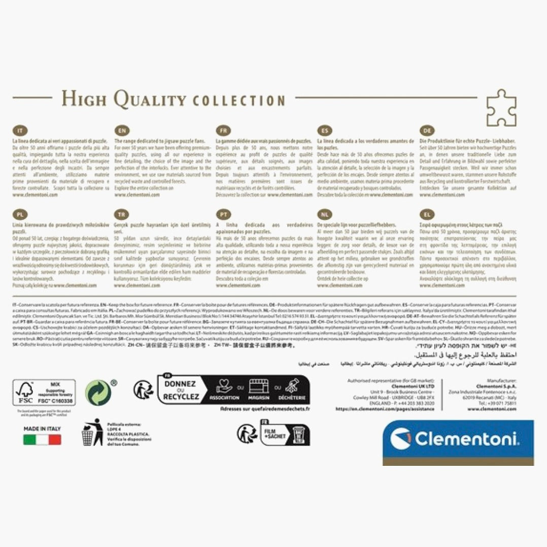Puzzel voor volwassenen, 1000 stukjes Afmetingen complete puzzel: 70 x 50 cm De meest aansprekende afbeeldingen, de grootste verscheidenheid aan formaten en de kenmerkende Clementoni-kwaliteit voor een reeks die overal de gouden standaard is voor liefhebbers van puzzels. Clementoni houdt altijd rekening met het milieu en maakt daarom veelvuldig gebruik van gerecyclede materialen, waarbij gebruik van vervuilende onderdelen wordt vermeden. Made in Italy. Ga naar het gedeelte Assistentie van Clementoni om gebruik te maken van de service "kwijtgeraakte stukjes"