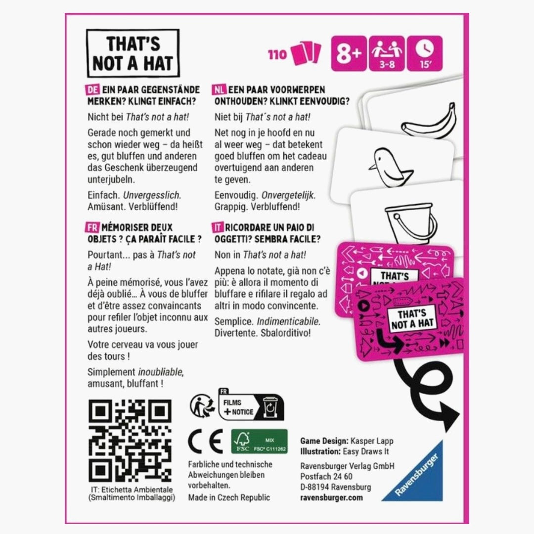 Daag je geheugen en blufvaardigheden uit met Ravensburger – That's Not a Hat, een hilarisch en spannend kaartspel waarin spelers elkaar cadeautjes geven en proberen te onthouden welk cadeau ze voor zich hebben liggen. Maar pas op, als je niet zeker weet welk cadeau voor je ligt, moet je je blufvaardigheden inzetten en overtuigend doen alsof je het wél weet. Wees voorbereid, want als je bluf doorzien wordt, krijg je minpunten!