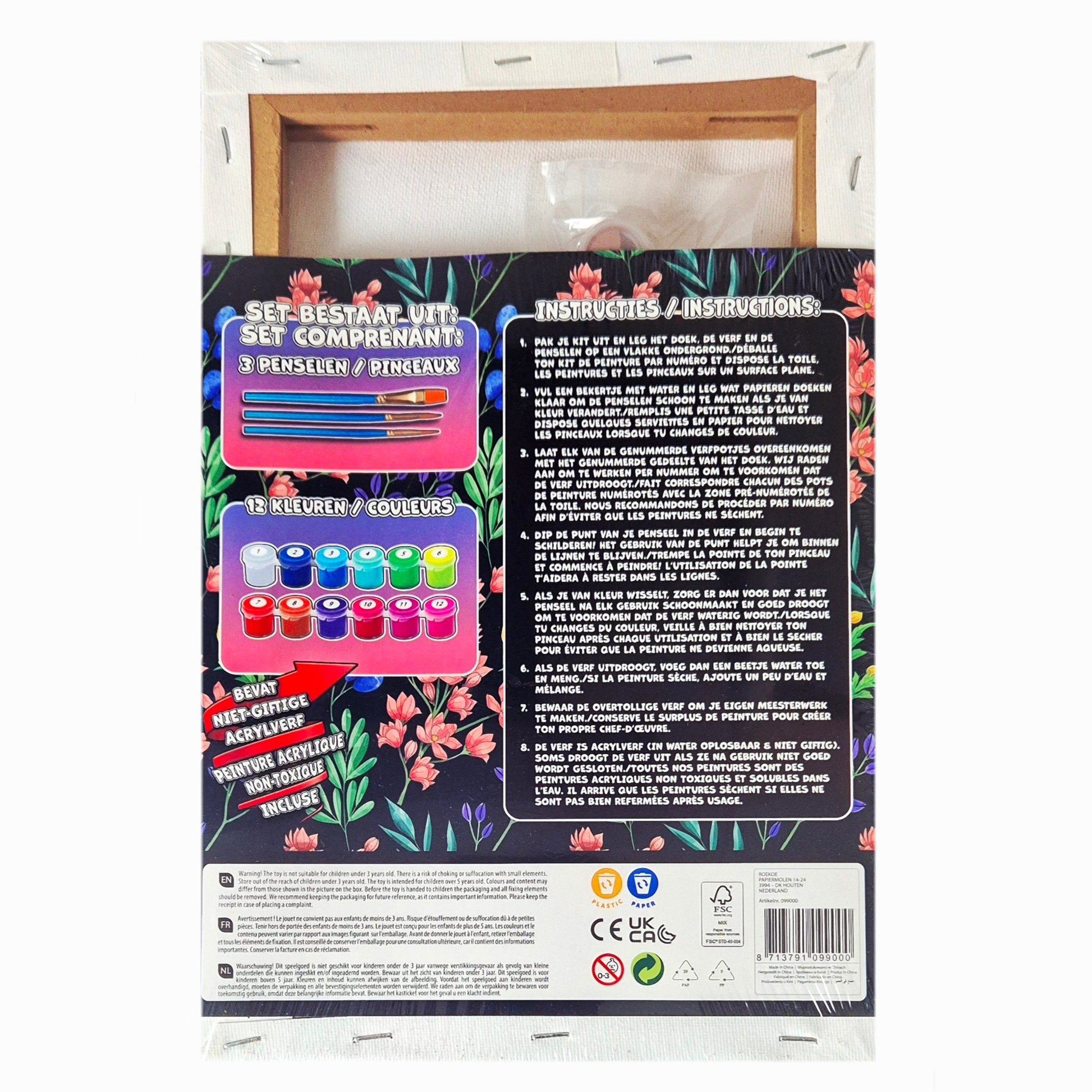 Het canvas van ca. 20 x 30 cm is strak gespannen op een stevig houten frame, zodat je schilderij na voltooiing direct klaar is om op te hangen – geen extra lijsten of afwerking nodig.