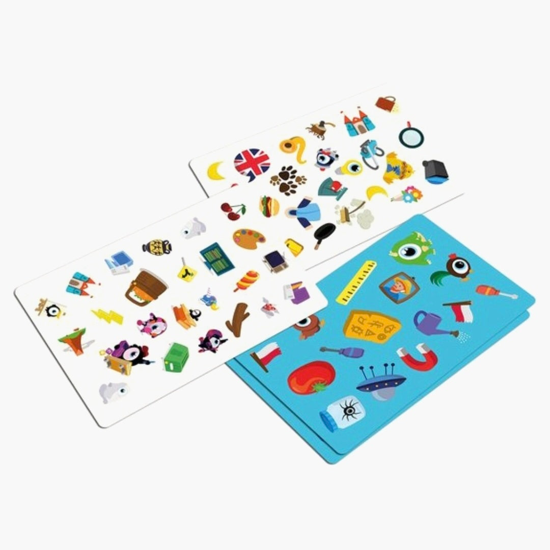 In dit spel gaat het er om dat je zo snel mogelijk ziet welk voorwerp 2x op de kaart staat! Alle spelers doen mee, dus je moet echt vliegensvlug zijn! Op elke kaart staan ook 2 dezelfde voorwerpen met allebei een andere kleur - ben je nu nog steeds de snelste? Daarnaast staan op elke kaart nog 2 voorwerpen die met elkaar te maken hebben, zoals een zon en een maan of een hamer en een zaag. Zie jij het verband en ben je ook weer de snelste?