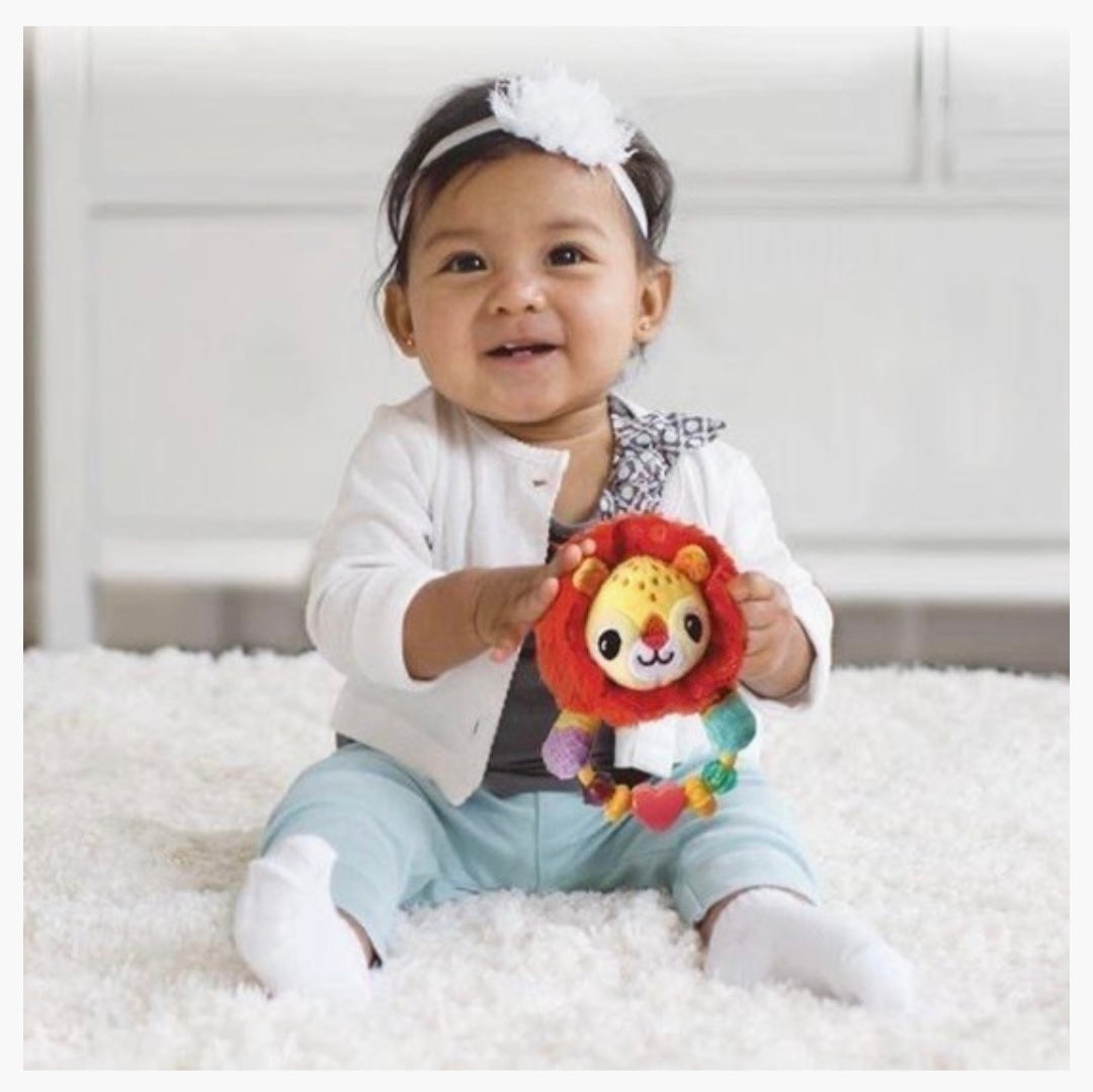 De zachte, kleurrijke stof moedigt het kleintje aan om met het leeuwtje te spelen