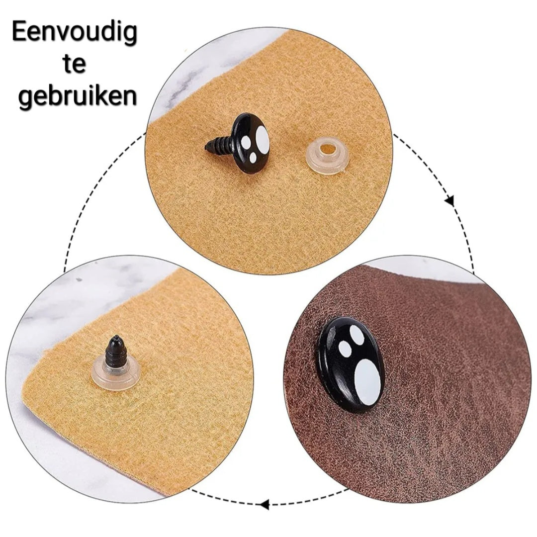 Veiligheidsoogjes met sluitringen. De veiligheidsoogjes zijn van hoogwaardig kunstof en zijn van hoge kwaliteit en met stevige sluitringen erbij.